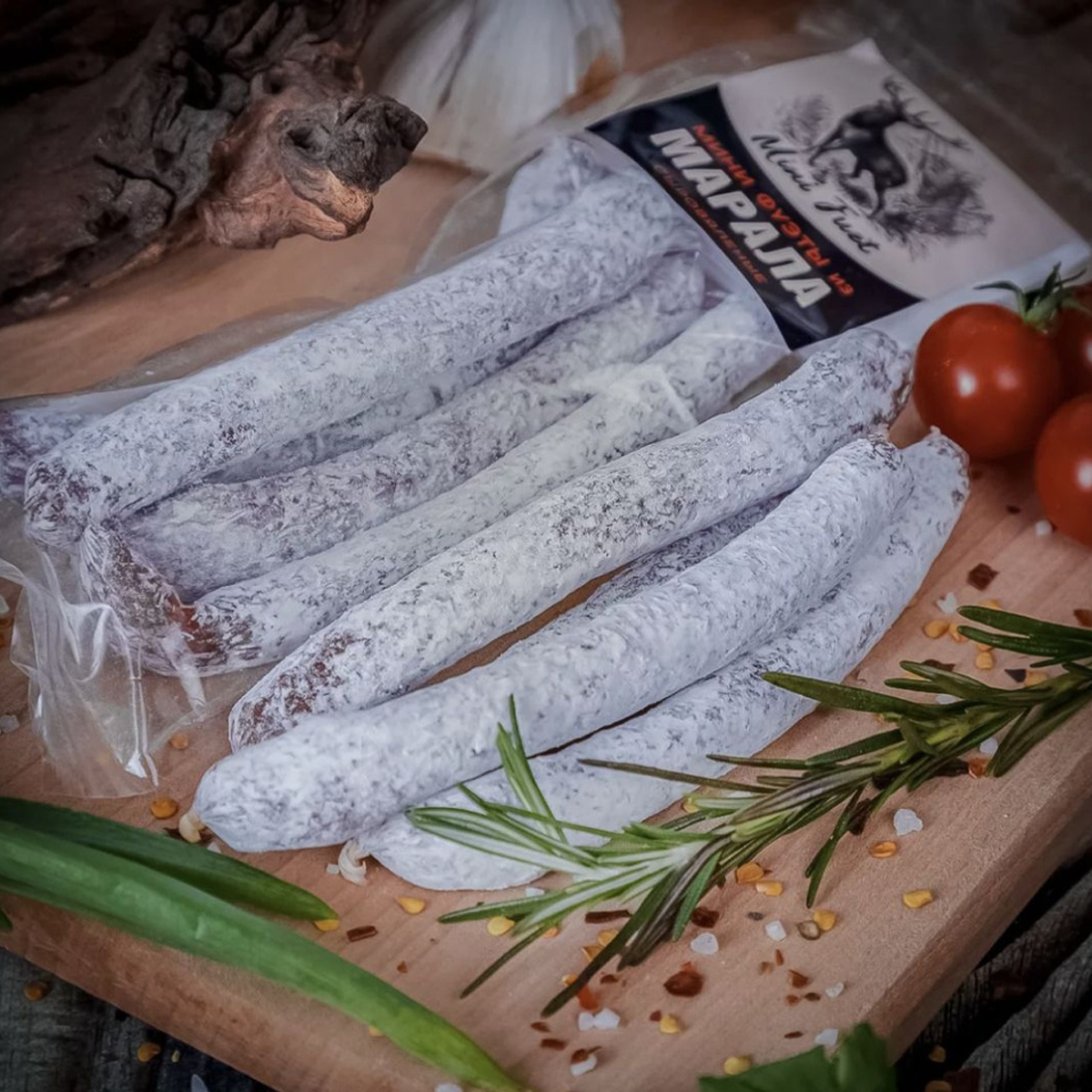 Мини фуэты сыровяленые Охота из натурального мяса марала, с добавлением хребтового шпига и ароматных специй.