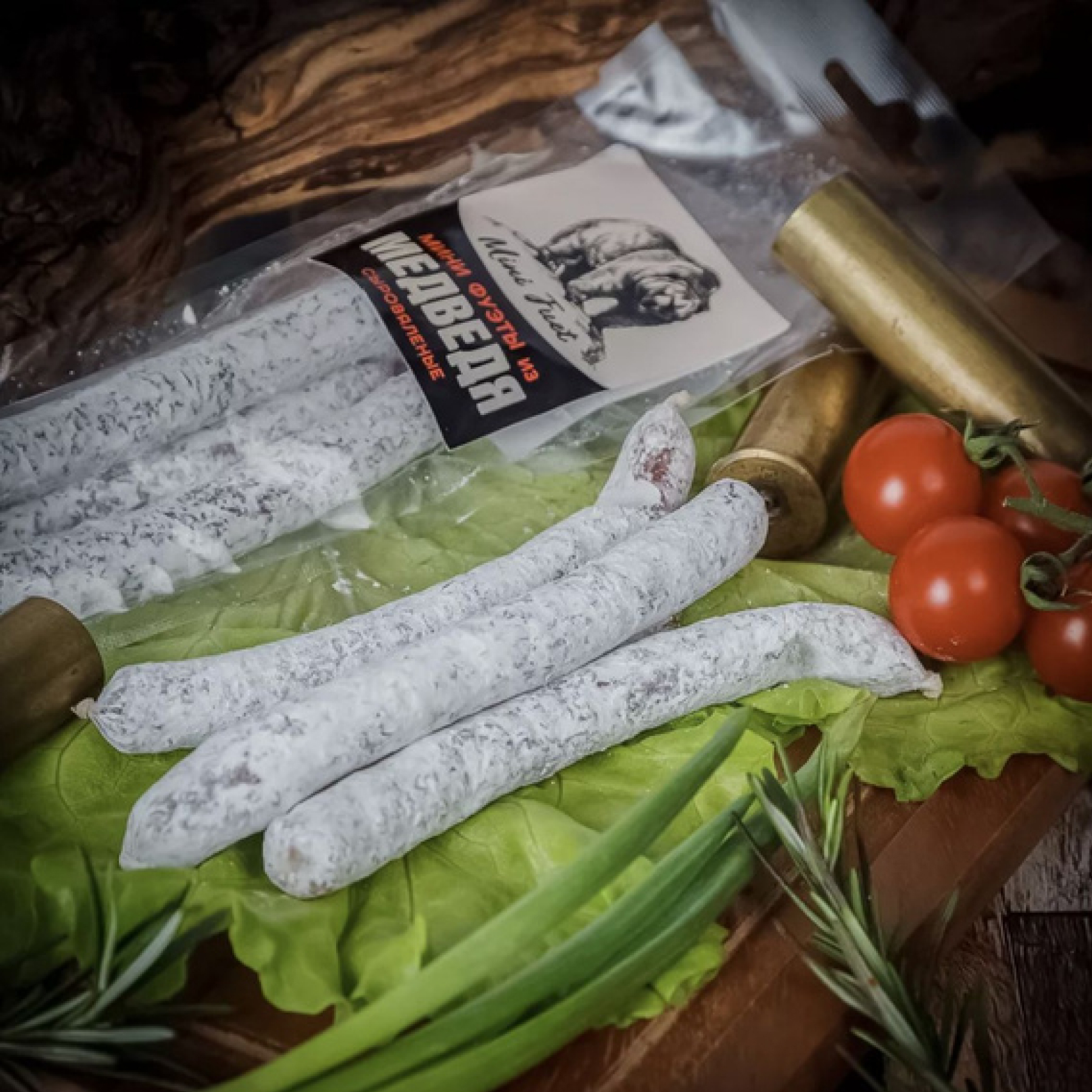 Эксклюзивная сыровяленая колбаса из мяса медведя изготовлена только из натурального сырья и специй. Для улучшения вкуса и большей сочности в состав добавлены специи и шпик. Специи придают продукту пикантности, но при этом чувствуются деликатно. Колбаса оригинально дополнит мясное ассорти и станет экзотической закуской.