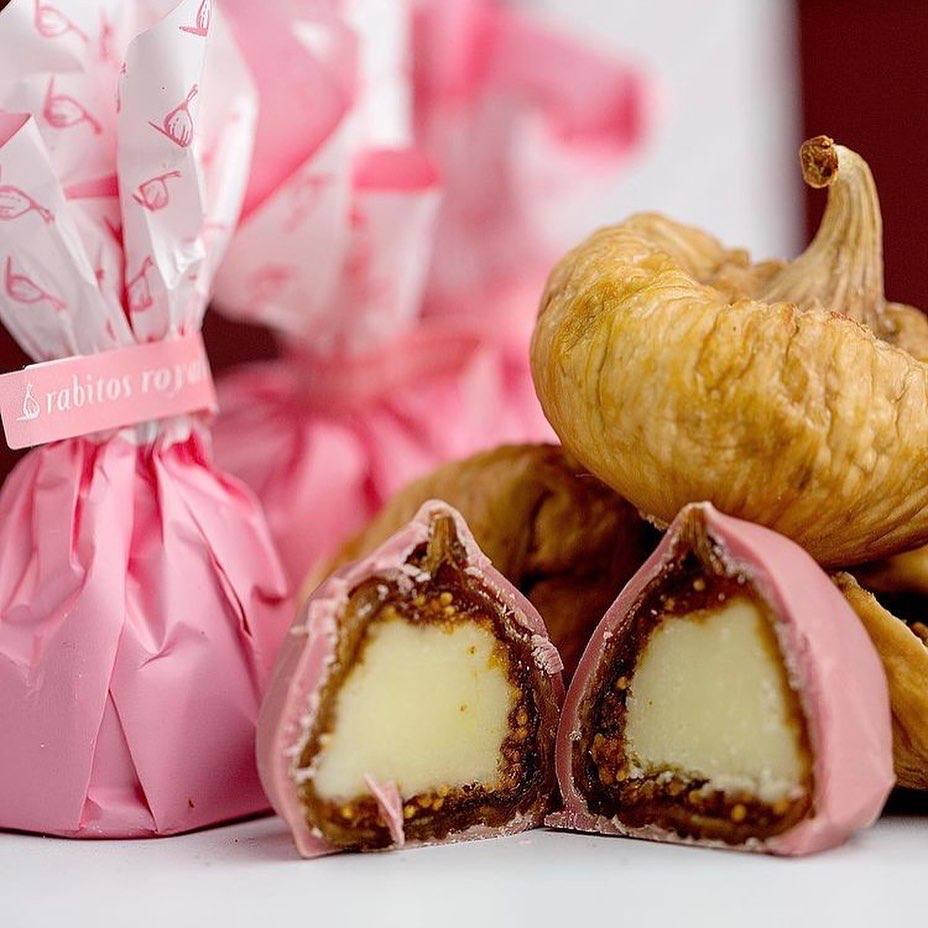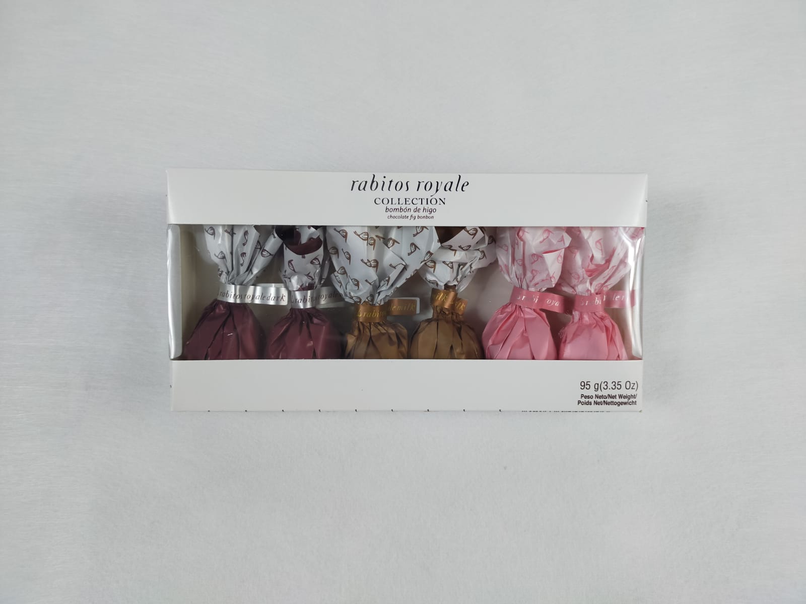 Инжир в шоколаде "Rabitos Royale" - это великолепное творение испанских кондитеров, которое подарит вам истинное наслаждение! Конфеты выполнены из отборного сухого сладкого инжира сорта Калабасита и покрыты тонким слоем шоколада. Начинка из трюфельного крема из белого или тёмного шоколада с различными дополнениями: в виде Бренди, мусса из солёной карамели, с добавлением ликёра Марко де Кава в сочетании со сладким инжиром подарят вам мгновения истинного наслаждения!