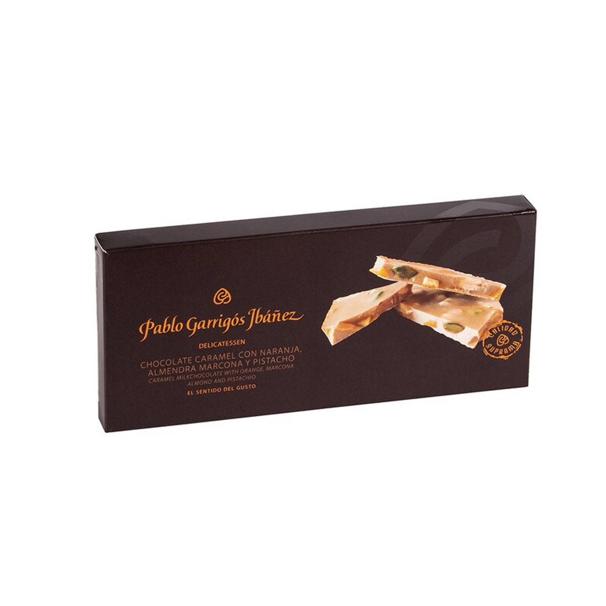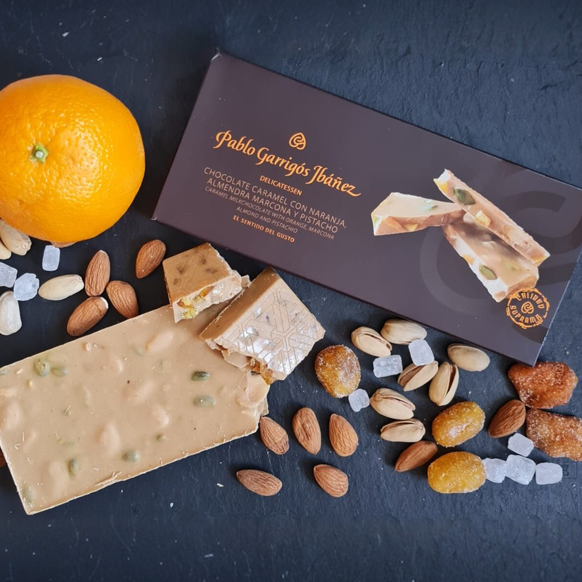Необычный туррон из карамельного шоколада с апельсином, миндалём и фисташками.