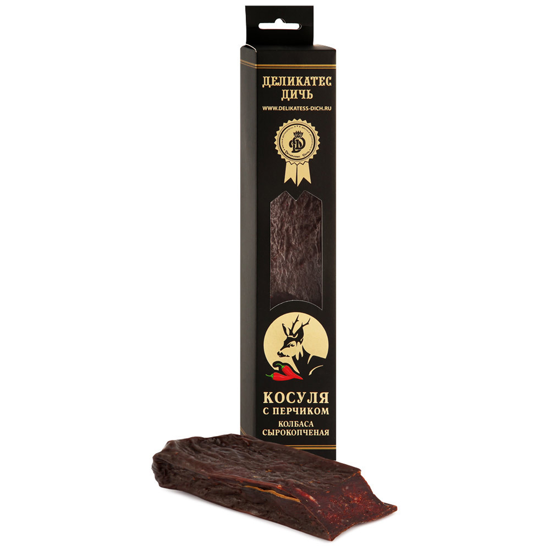 Сырокопченая колбаса Косуля с перчиком - настоящий подарок для любителей деликатесов из дичи. Обладает необычным и в меру острым вкусом. Колбаса упругая, включает небольшие жилки, но при этом хорошо жуется.