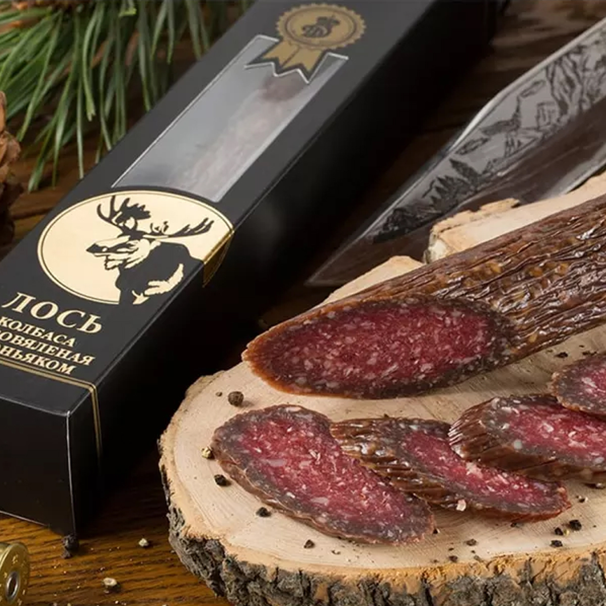 Колбаса Лось с коньяком сыровяленая, в подарочной упаковке