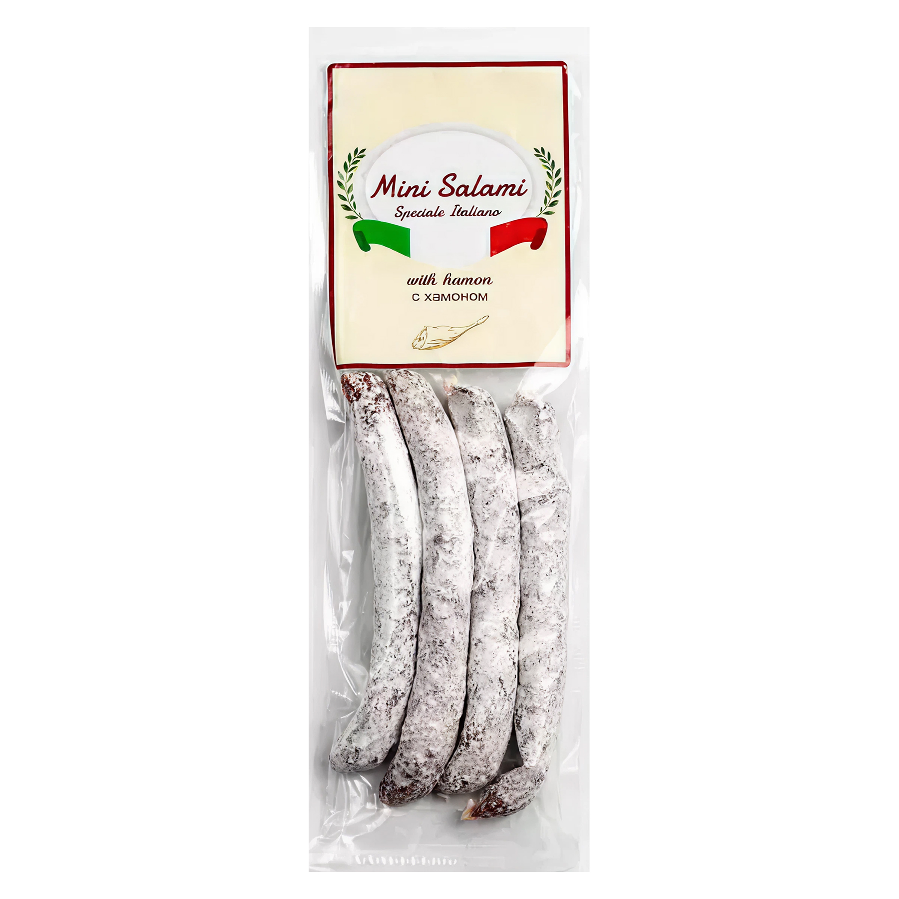 Сыровяленые колбаски из свиного сыровяленого окорока с добавлением ароматных специй и перца. Хамон придаёт особую пикантность вкусу колбасок.