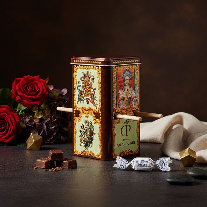 "Palanquines" переводится как переносные носилки для вельмож. Внутри находятся изумительные конфеты с пралине, покрытые молочным шоколадом. Жестяная коробка, в которую упаковываются конфеты, имеет четыре отверстия и две деревянные палочки в комплекте для имитации паланкинов. В основе традиционный винтажный дизайн, который разрабатывается лучшими художниками и дизайнерами фабрики.