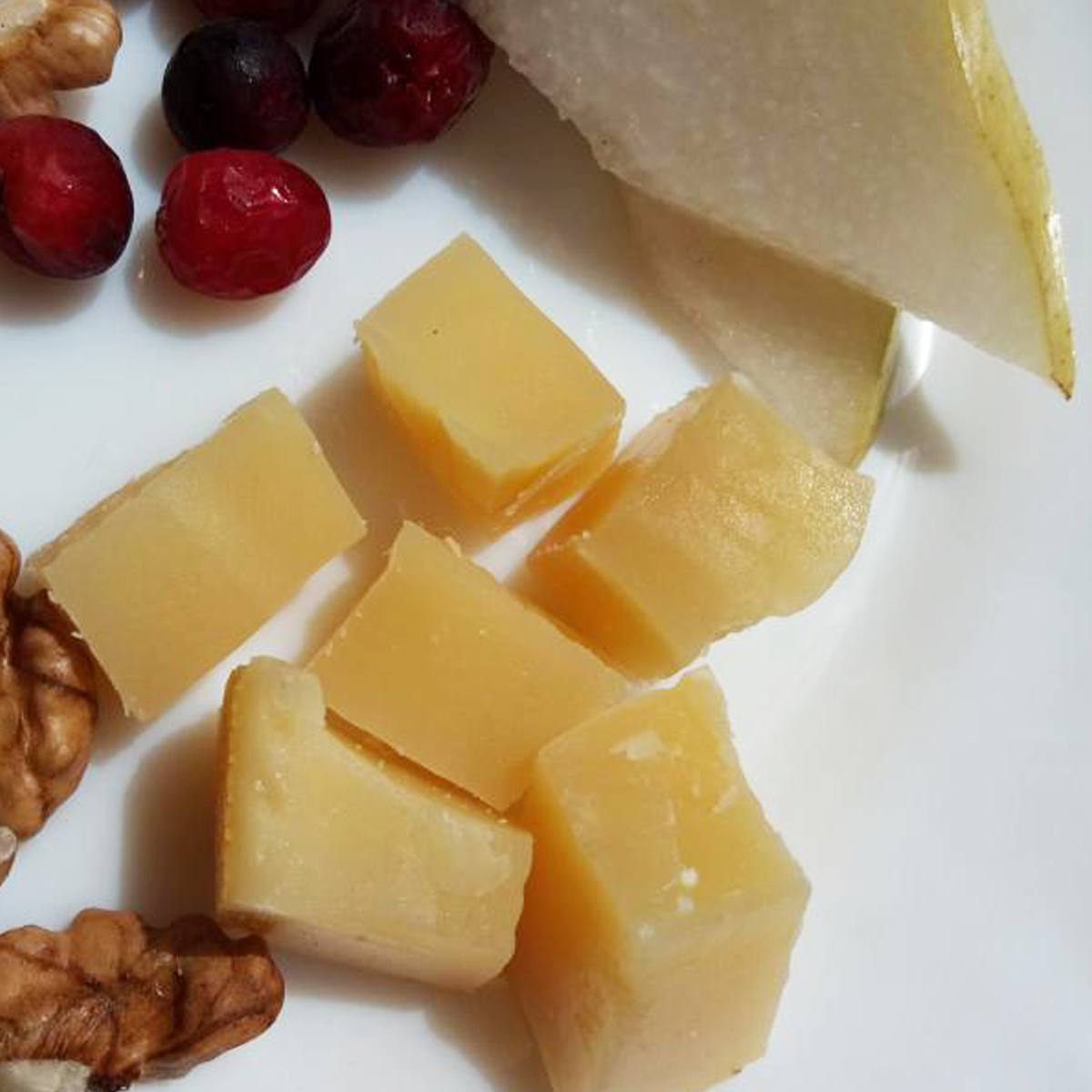 Мелкие, но видимые кристаллы соли и белка подчеркивают его идеально выдержанные качества и эксклюзивный характер. Этот сыр идеально подходит для сервировки на сырной тарелке или для использования в кулинарии.