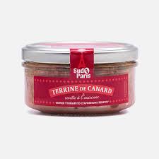 Террин утиный приготовлен по старинному рецепту с добавлением белого вина. Основным ингредиентом данного блюда является мясо утки и куриная печень. В мясо добавляют морковь, шалот, специи. Продукт имеет нежную консистенцию паштета и мягкий вкус.