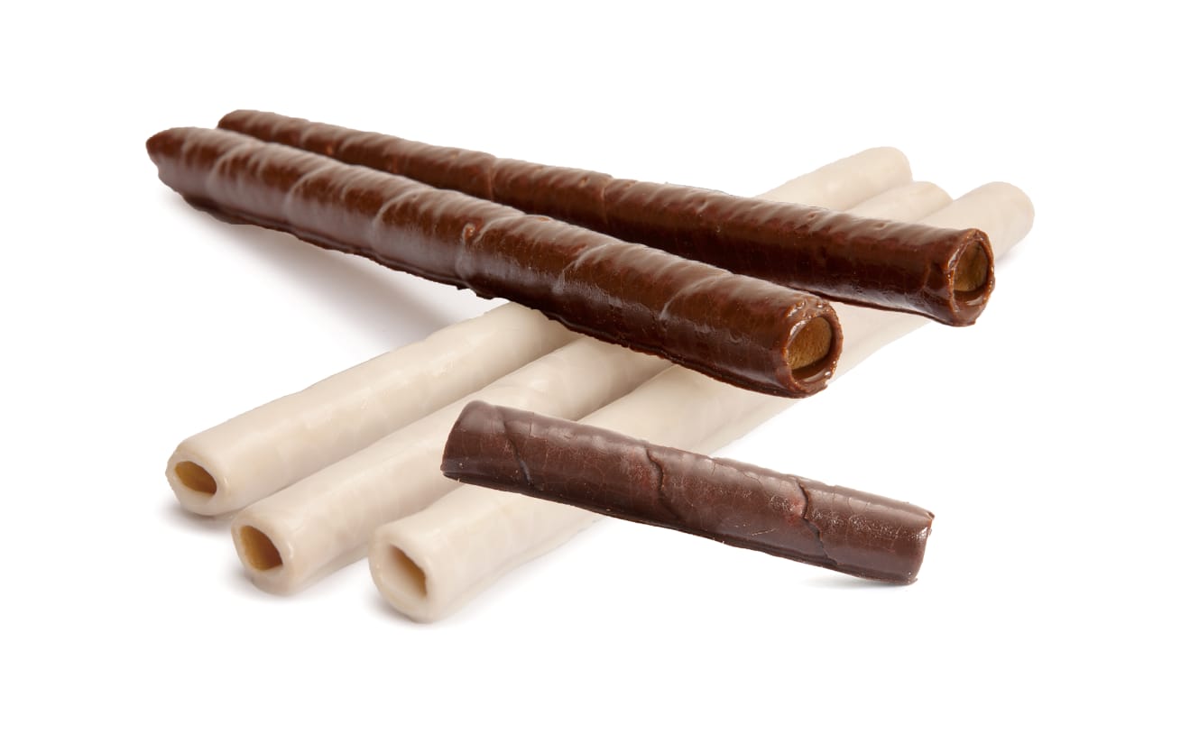 В одной коробке два вкуса раскатанных вафель: ванильные и облитые какао.