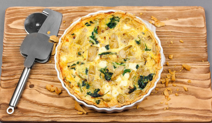 - Слегка взбейте яйца в большой миске, добавьте сыры и шпинат, затем добавьте артишоки и лук.