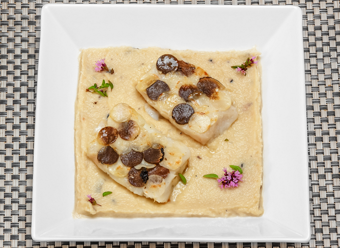 10. Подача: К пюре добавьте нарубленные трюфели и накройте крышкой, чтобы пюре пропиталось ароматом. Рыбу приправьте фле – де сель и перцем.